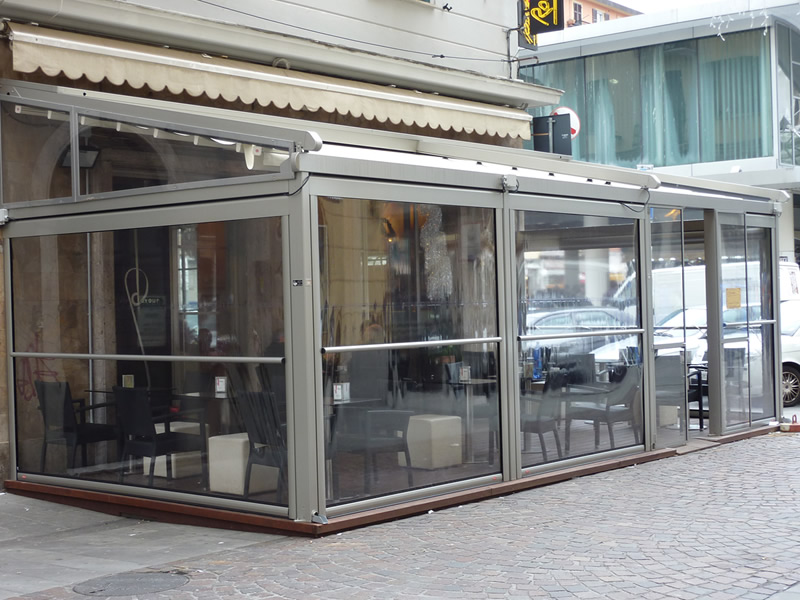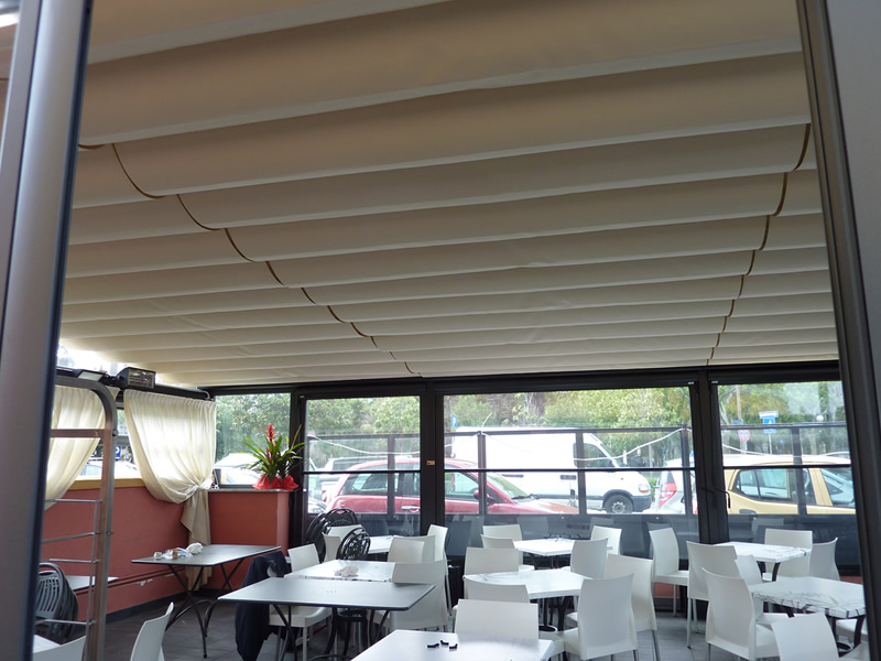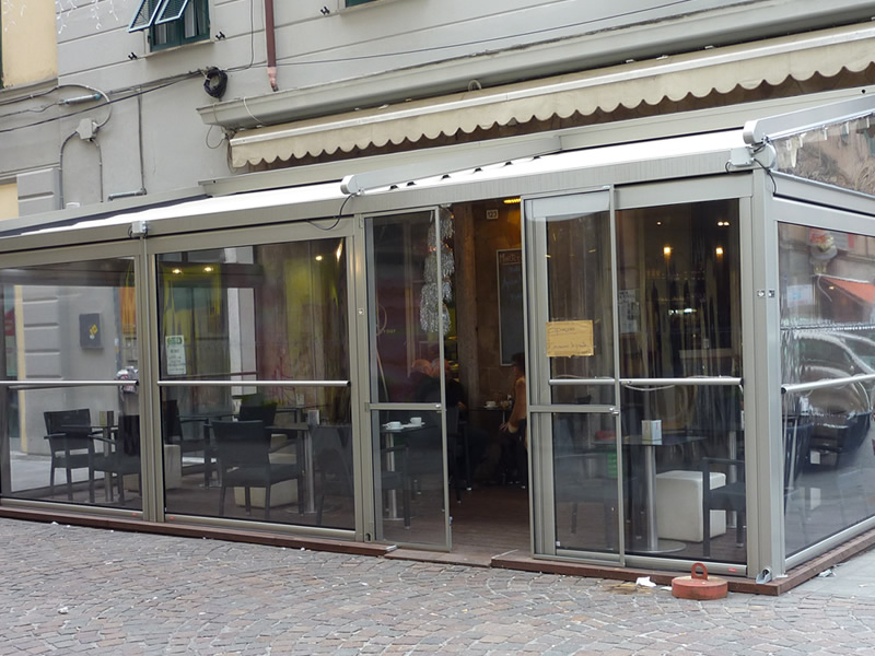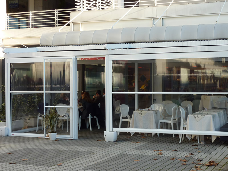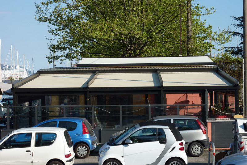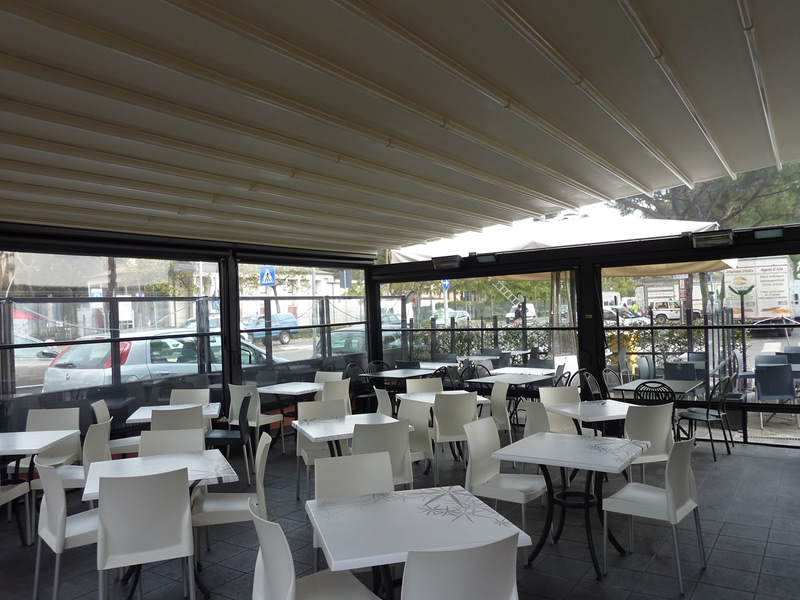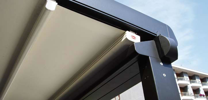 Tutte le strutture Mediterranea sono predisposte per la copertura laterale e frontale in modo da ottenere un ambiente esterno perfettamente isolato dagli agenti atmosferici, anche in virtù del sistema di canalizzazione dell'acqua piovana integrato.