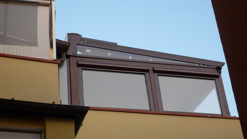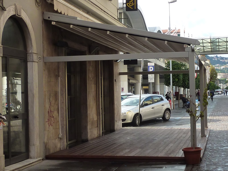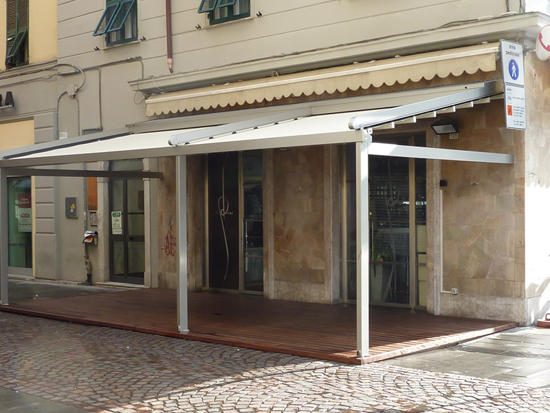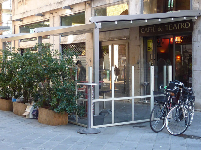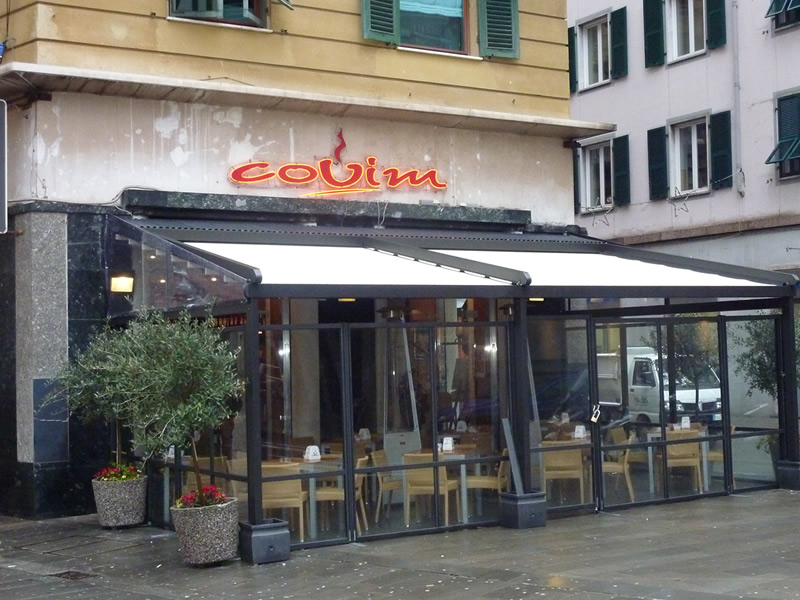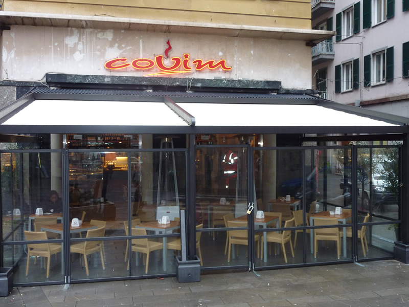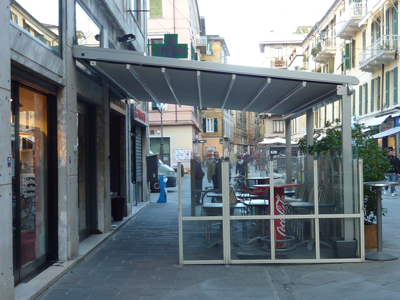 Tutte le strutture Mediterranea sono predisposte per la copertura laterale e frontale in modo da ottenere un ambiente esterno perfettamente isolato dagli agenti atmosferici, anche in virtù del sistema di canalizzazione dell'acqua piovana integrato.